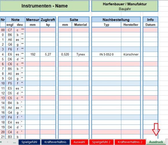 Seit der Version 1.27 gibt es einen weiteren Karteireiter in dunkelgrün namens Ausdruck, um nur die wesentlichen Informationen des Saitenplanes auf einem DIN-A4 Blatt im Hochformat auszudrucken. So kann man unterwegs schnell auf einem Stück Papier in seinem Reserve-Saitensatz nach der richtigen Saite suchen und sich handschriftliche Notizen zur eventuellen Nachbestellung machen.