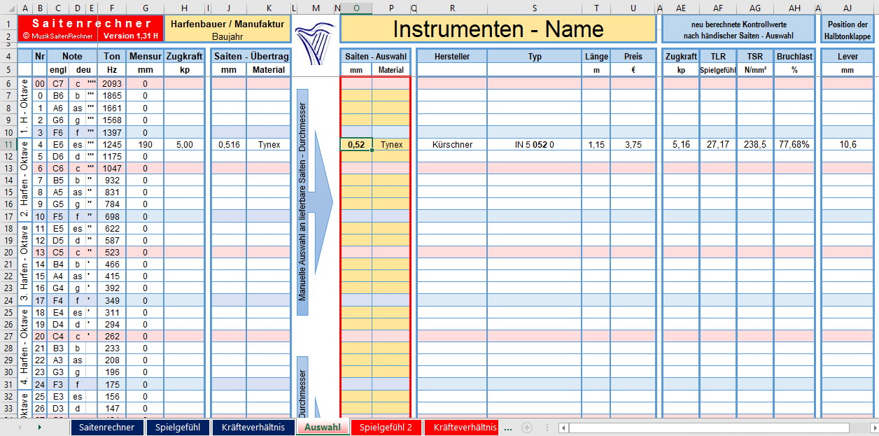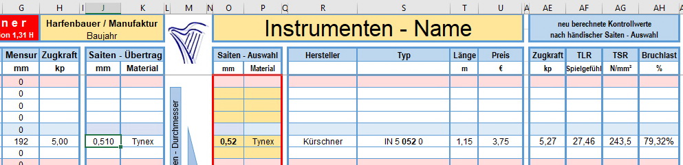 Dadurch, dass der Saitendurchmesser (und ggf. auch das Material) verändert wurde, stimmt das ursprünglich errechnete Kräftegefüge, die Saitenspannung, das Spielgefühl und die prozentuale Bruchlast nicht mehr. Diese Werte werden in den Spalten AE AF AG AH neu berechnet.