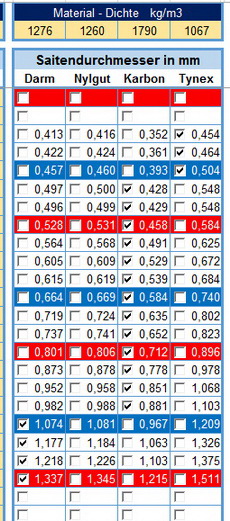 In der blauen Registerkarte "Saitenrechner" haben wir eine Tynexsaite mit einem Durchmesser von 0,51 mm errechnet und mit einem Häkchen in der Spalte AD auf das rote Registerblatt "Auswahl" in Spalte J übernommen.
