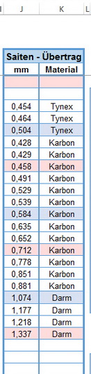 Die folgende Saitenauswahl haben ich im ersten Arbeitsblatt bei den errechneten Saitendurchmessern mit Häkchen versehen und wie wir erkennen können, sind diese Einträge 1:1 im neuen Registerblatt "Auswahl" in den Spalten J und K angekommen.