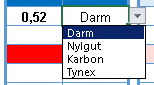 Die Spalte P öffnet beim Klick auf die Zelle ein Pulldown-Menü aus dem das Saitenmaterial ausgewählt werden kann. Man muss sich also nicht stur an die (ursprünglich ausgewählte) Vorgabe aus Spalte K halten, sondern kann an dieser Stelle auch noch mal mit anderem Saitenmaterial und Durchmessern experimentieren.