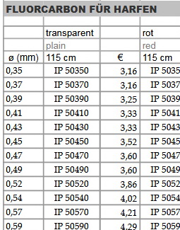 Als Beispiel links ein kleiner Auszug aus einer Saitenliste für Karbonsaiten (Fa. Kürschner).